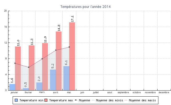 | janvier | 1.6 °C | 6.8 °C | 11.0 °C | 6.8 °C | 6.8 °C | 4.1 km/h | 25.7 km/h | SSO |