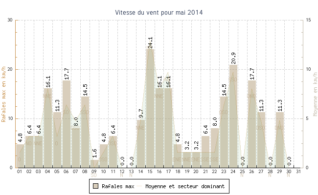 | min | max | moy | Vitesse (rafales) | Secteur | ||